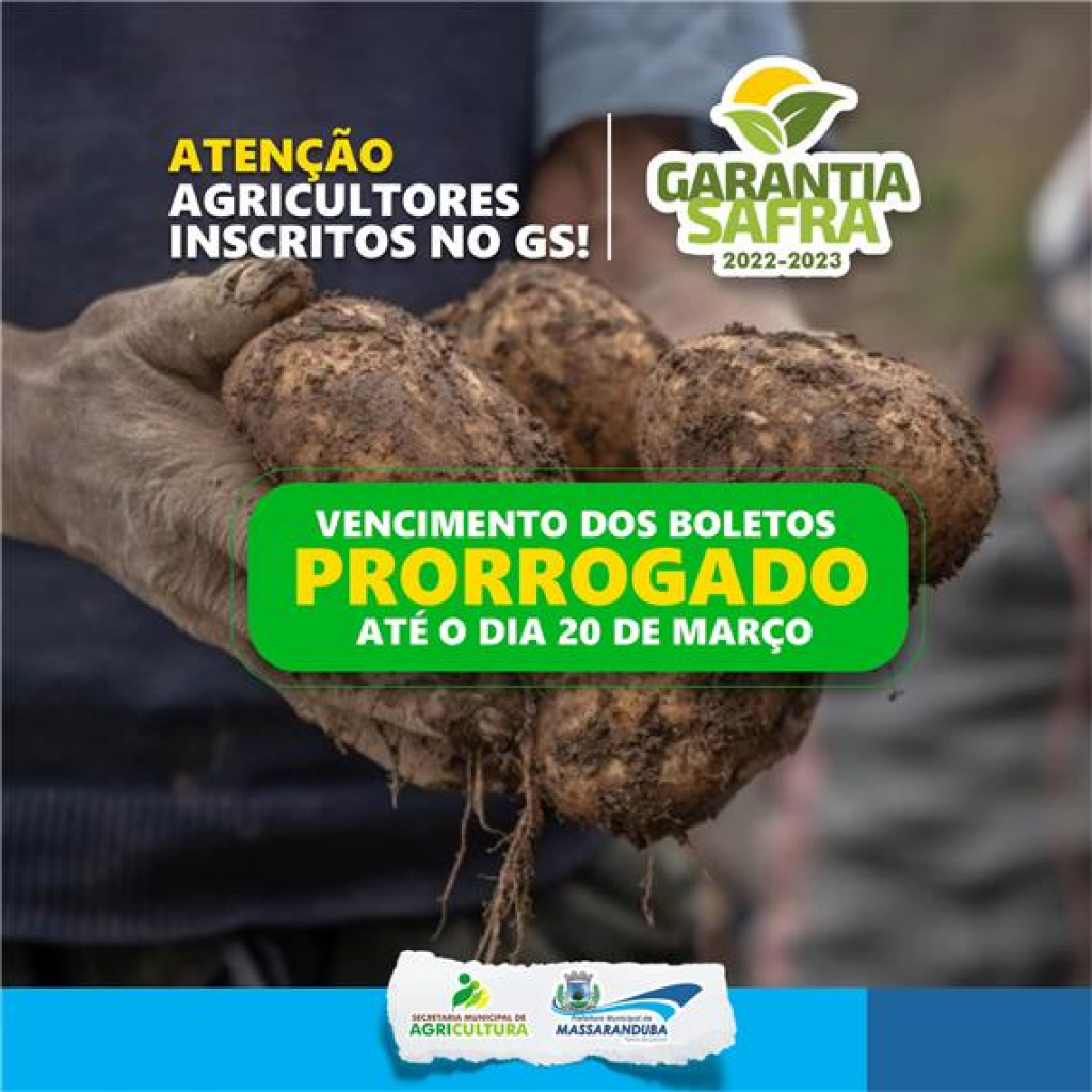 O prazo para pagamento do boleto referente a taxa de adesão ao programa Garantia Safra 2022-2023, foi prorrogado e vai até o dia 20 de março.