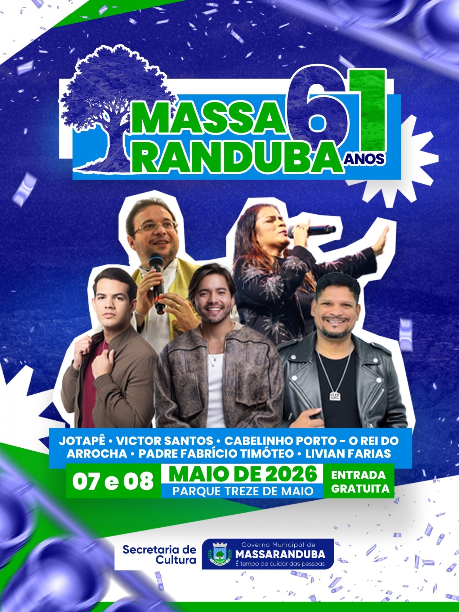cidade de Massaranduba já está em clima de festa para comemorar seus 61 anos de emancipação política. A programação especial acontecerá nos dias 07 e 08 de maio de 2026, no Parque Treze de Maio, com entrada gratuita e atrações que prometem reunir um grande público.