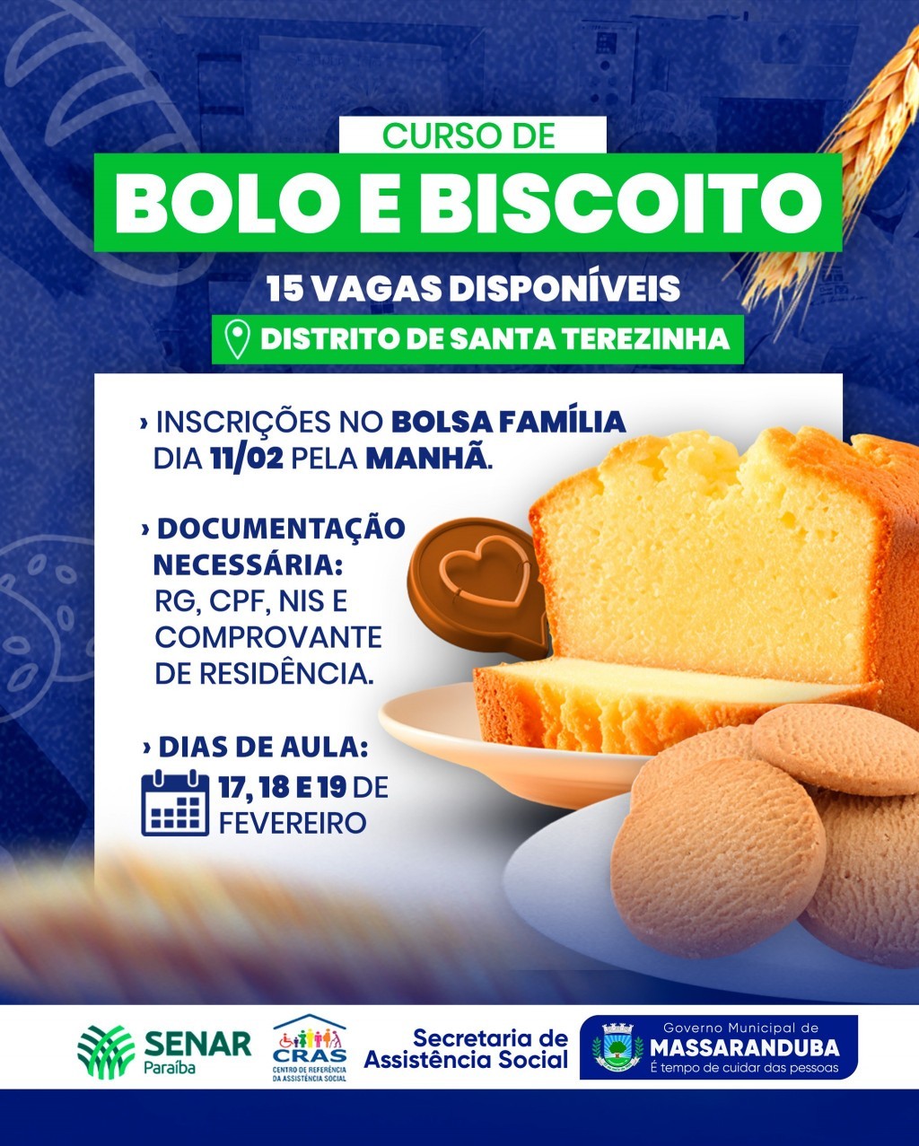 A Secretaria de Assistência Social disponibilizou 15 vagas para o curso de bolos e biscoitos. O curso acontecerá no distrito de Santa Terezinha e as aulas vão ocorrer nos dias 17, 18 e 19 de fevereiro, com instrutores qualificados.