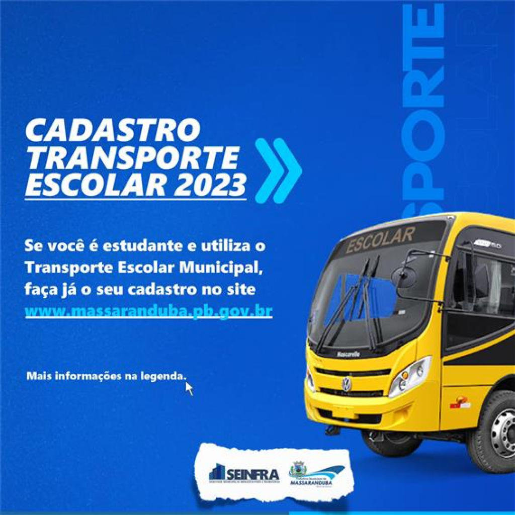 O novo cadastro para uso do Transporte Escolar Municipal, no ano letivo de 2023, estará aberto até 29 de fevereiro no site da Prefeitura Municipal (www.massaranduba.pb.gov.br).