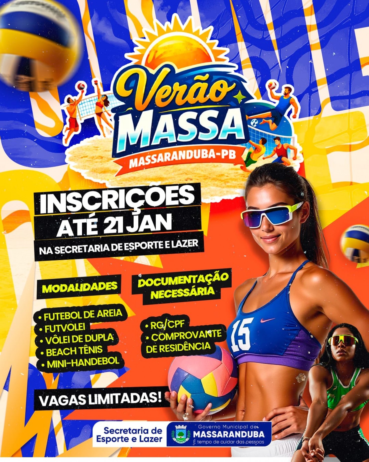 As inscrições para as competições do Verão Massa encerram-se no dia 21 de janeiro. Os interessados devem procurar a secretaria de esportes e lazer, das 8h às 12h, munidos do RG, CPF e comprovante de residência, para garantir a sua inscrição.