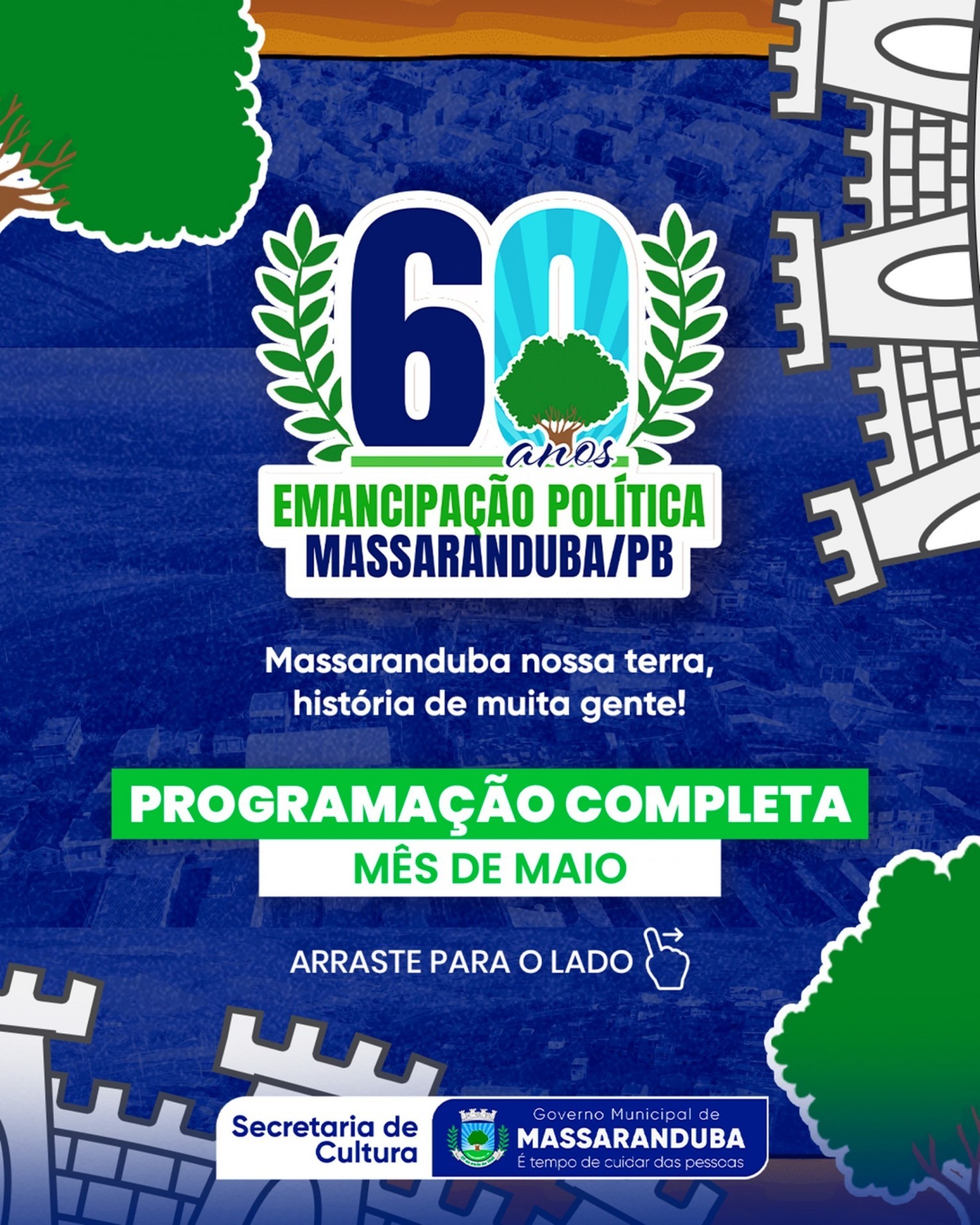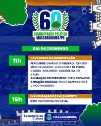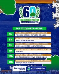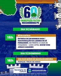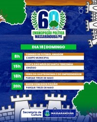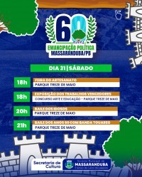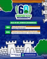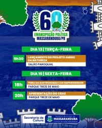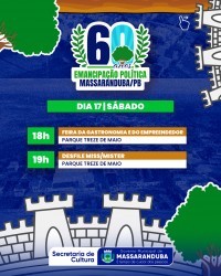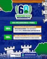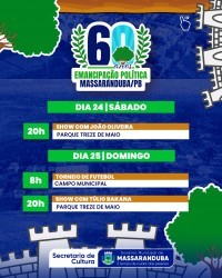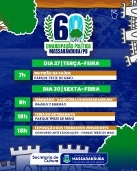 O município de Massaranduba, localizado no Agreste paraibano, celebra em 2025 os seus 60 anos de emancipação política. Em alusão à data, será realizada uma programação comemorativa entre os dias 4 de maio e 1º de junho, reunindo eventos culturais, esportivos, religiosos e de lazer. Todas as atividades são gratuitas e abertas ao público.