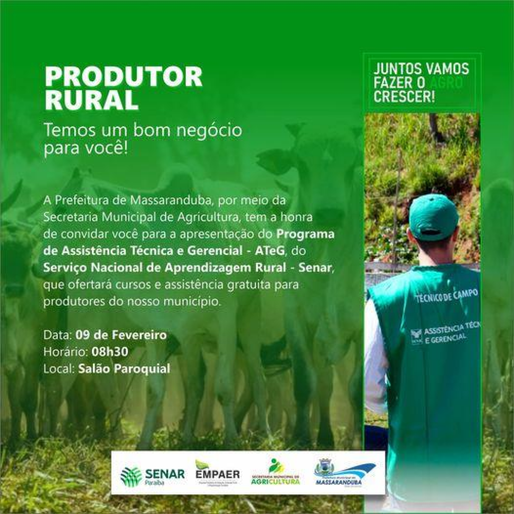 Por meio da Secretaria Municipal de Agricultura, a Prefeitura de Massaranduba tem a honra de convidar a você para a apresentação do Programa de Assistência Técnica e Gerencial (ATeG) do SENAR, que prestará serviços gratuitos para produtores massarandubenses, selecionado como “Município Produtor de Gado de Corte”.