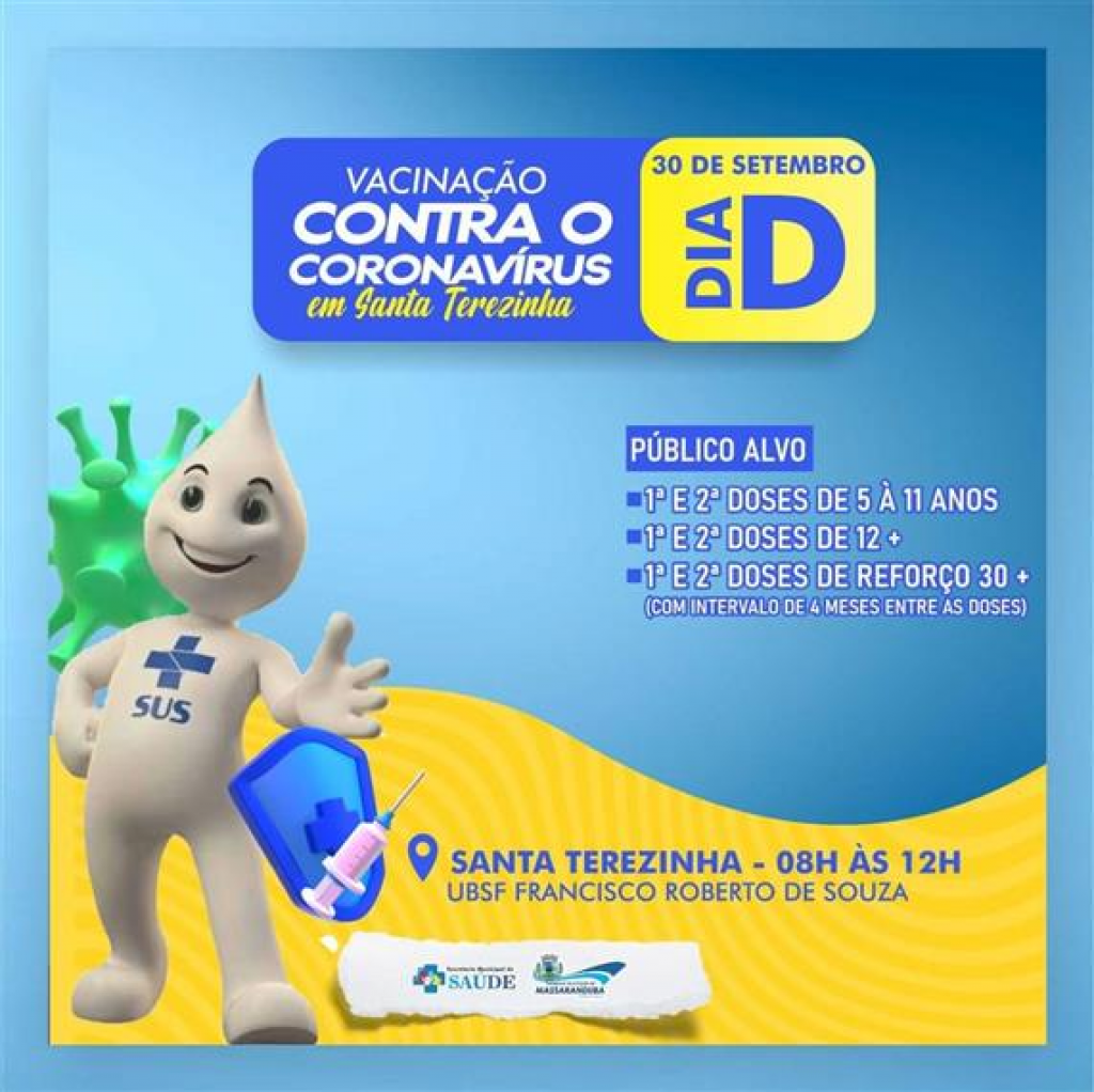Nesta sexta-feira , 30, acontece o "Dia D" da Campanha de Vacinação Contra o Coronavírus no distrito Santa Terezinha. O atendimento ocorre das 08h às 12h, na UBS Francisco Roberto de Souza.