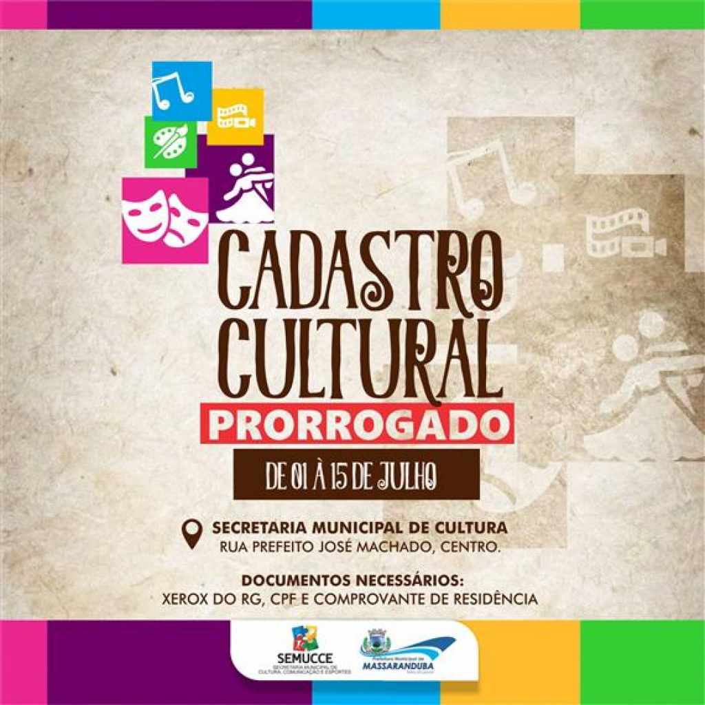 Por meio da Secretaria Municipal de Cultura, Comunicação e Esportes, a Prefeitura de Massaranduba prorrogou o novo Cadastro Cultural para o mapeamento e a atualização de integrantes do universo produtivo da Cultura em nossa cidade até o dia 15 de julho.