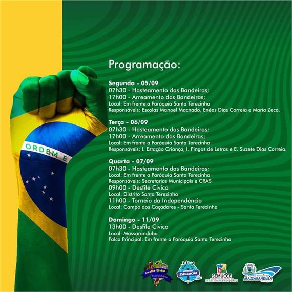 Nesta segunda-feira, 05, daremos início a Semana da Pátria 2022. Entre a programação que se estende até o próximo dia 11, teremos as solenidades de hasteamento e de arriamento das bandeiras que esse ano acontece em frente a Igreja Matriz da Paróquia Santa Terezinha, além do tradicional Torneio da Independência no distrito Santa Terezinha, e os nossos desfiles cívicos.