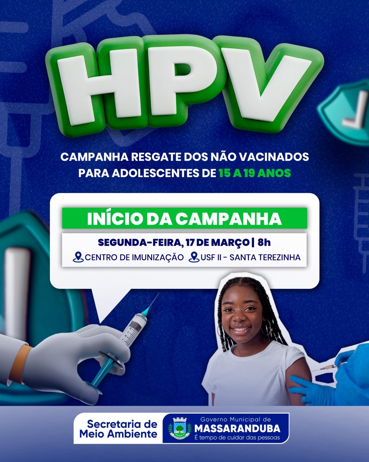 A Secretaria de Saúde dará início à Campanha "Resgate dos Não Vacinados", voltada para adolescentes de 15 a 19 anos. A ação começará na segunda-feira, 17 de março, às 8h, no Centro de Imunização da USF II, em Santa Terezinha. A iniciativa tem como objetivo reforçar a vacinação dessa faixa etária, garantindo a proteção contra o HPV.