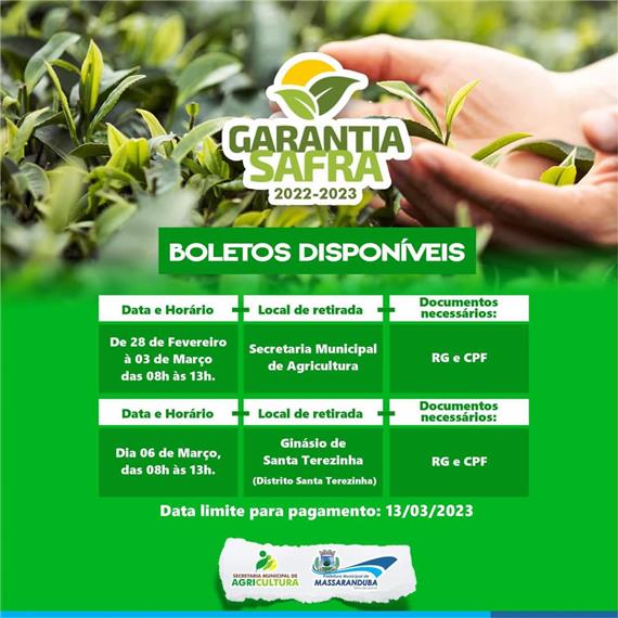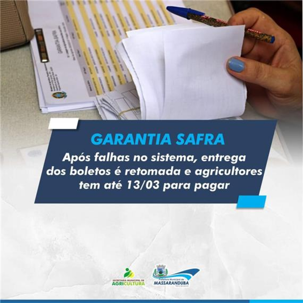 Após uma falha no sistema gerador dos boletos relacionados ao Programa Federal Garantia Safra, a Secretaria Municipal de Agricultura de Massaranduba informa que os boletos da edição 2022-2023 já estão disponíveis para retirada e pagamento.