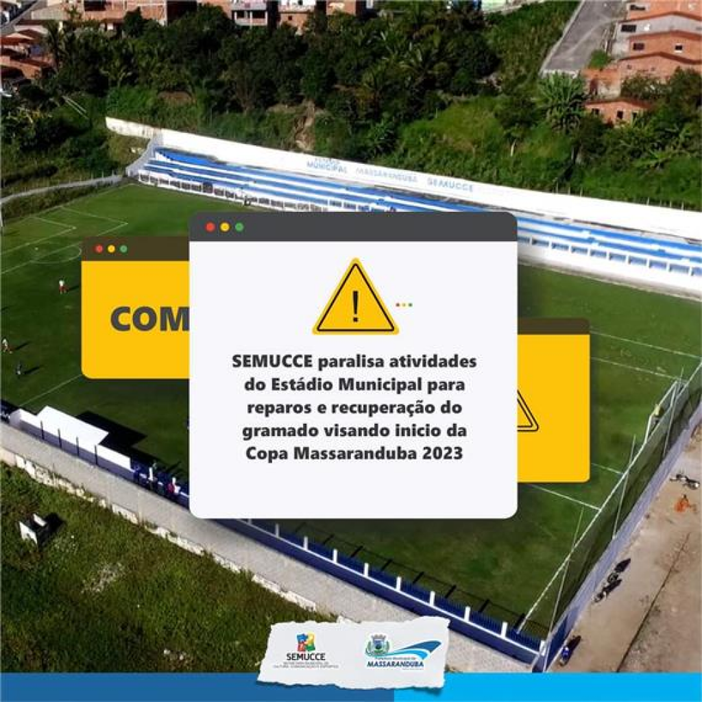 A SEMUCCE - Secretaria Municipal de Cultura, Comunicação e Esportes, comunica sobre a paralisação das atividades esportivas no Estádio Municipal “O Mendonção” para os serviços de reparo e recuperação do gramado, a contar do último dia 01, visando o início da Copa Massaranduba de Futebol Amador 2023, com abertura prevista para o dia 12 de agosto.