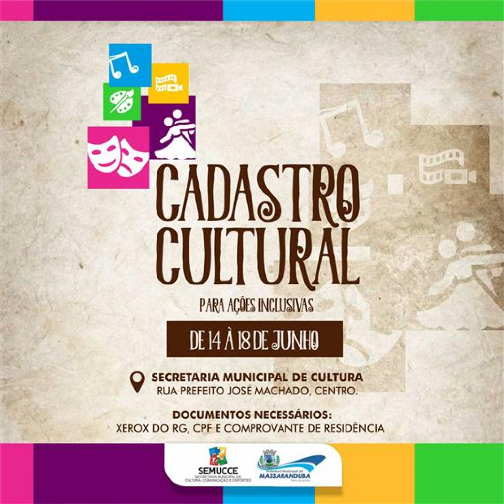 Por meio da Secretaria Municipal de Cultura, Comunicação e Esportes, a Prefeitura de Massaranduba iniciará na próxima segunda-feira, 14, o novo Cadastro Cultural para o mapeamento e a atualização de integrantes do universo produtivo da Cultura em nossa cidade.