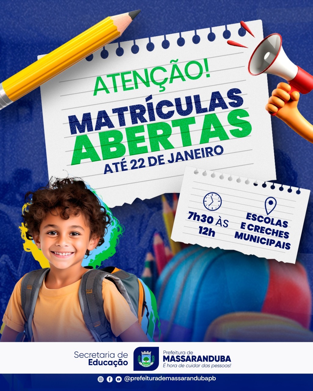 As matrículas estão sendo feitas apenas no período da manhã, das 7h30 até as 12h, para o nível infantil, a partir dos 02 ano de idade, o ensino fundamental regular e EJA.