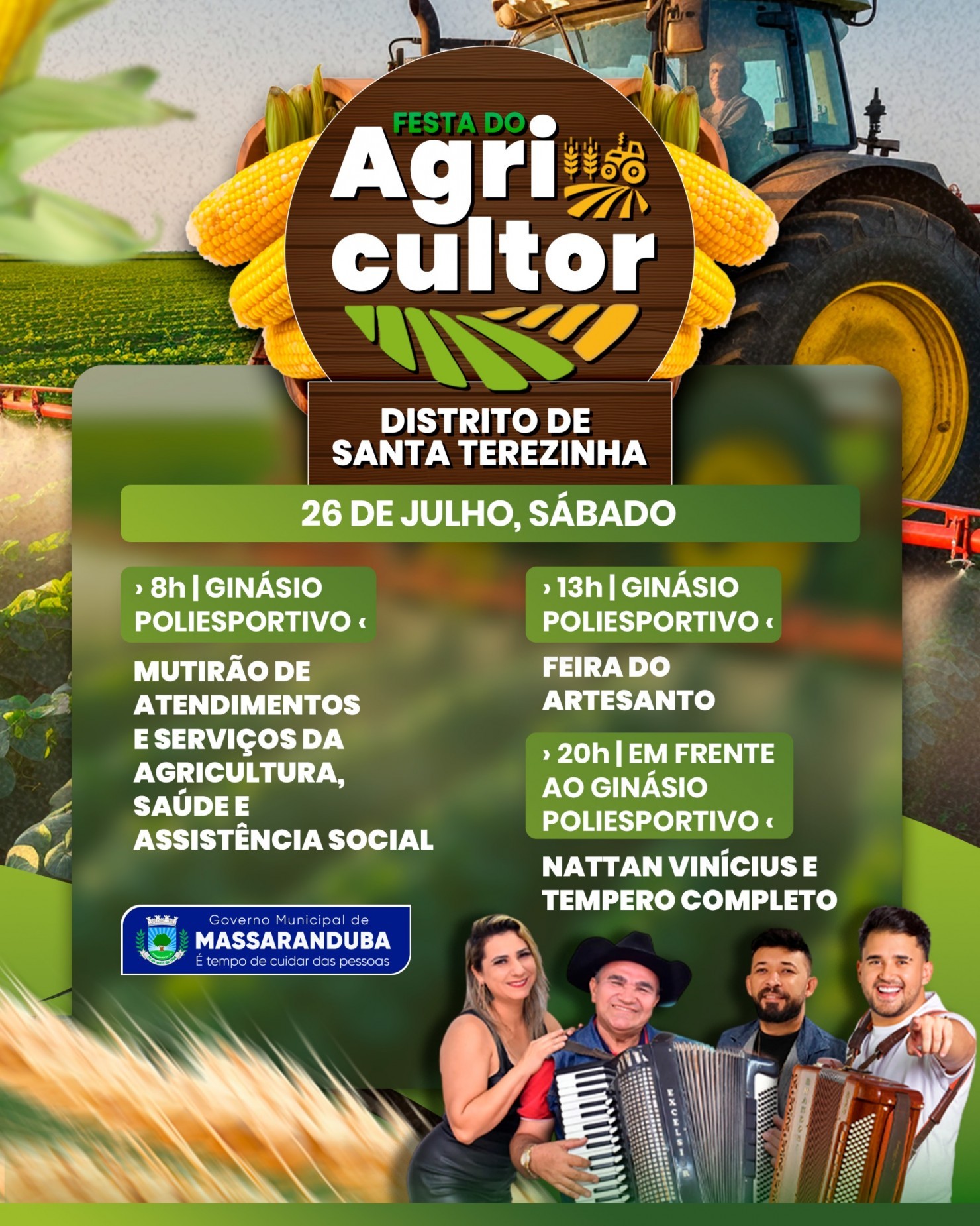 A Festa do Agricultor do distrito de Santa Terezinha acontecerá sábado (26) no Ginásio Poliesportivo Municipal e contará com uma programação diversificada voltada para toda a comunidade. As atividades terão início a partir das 8h, com um mutirão de atendimentos e serviços nas áreas de Agricultura, Saúde e Assistência Social. Às 13h, será realizada a Feira do Artesanato, valorizando o artesanato local e incentivando a economia na região e encerrando a programação, a partir das 20h, o público poderá aproveitar uma noite de muito forró em frente ao ginásio, com shows das bandas Nattan Vinícius e Tempero Completo.