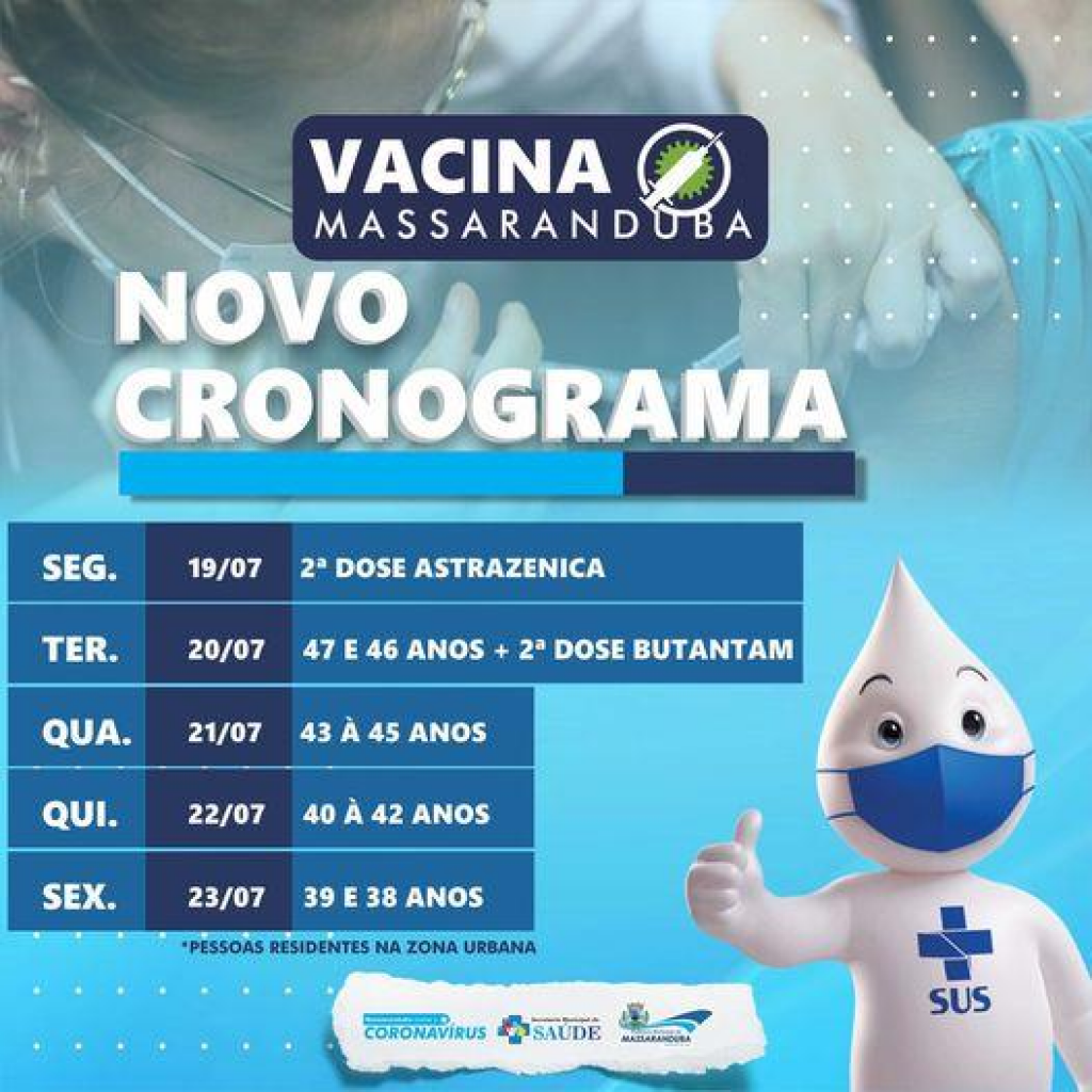 A partir desta segunda-feira (19), além de dar continuidade a aplicação das segundas doses da Astrazenica e Butantam (verificar o prazo no cartão de vacina), iniciaremos a imunização de novos públicos. Fique atento!