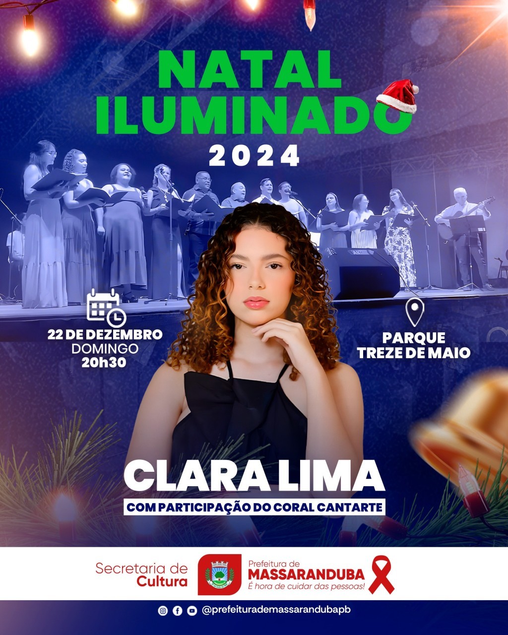 No domingo, dia 22, o Natal Iluminado de Massaranduba traz uma apresentação especial com Clara Lima com participação especial do Coral Cantarte. O evento acontece a partir das 20h30, no Parque Treze de Maio, prometendo uma noite mágica repleta de música e emoção.