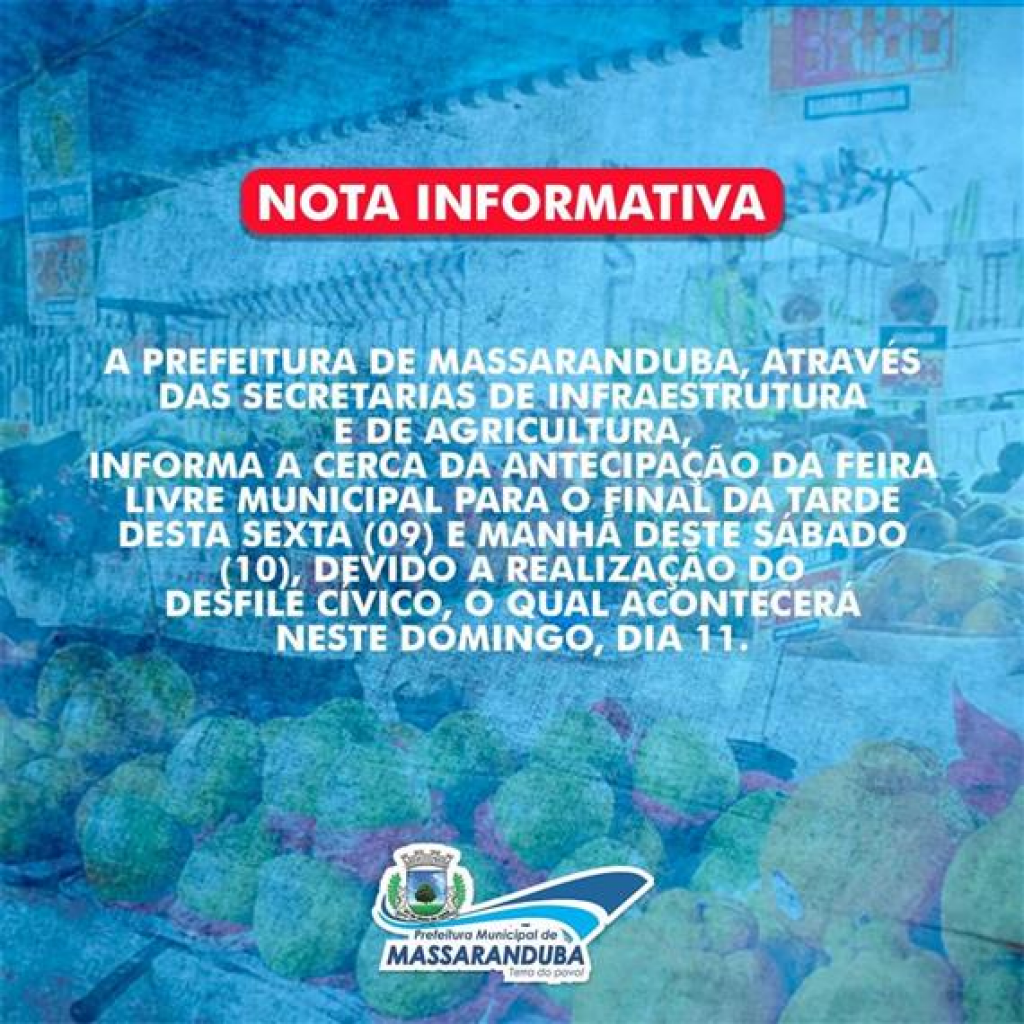 A Prefeitura de Massaranduba, através das secretarias de Infraestrutura e de Agricultura, informa a cerca da antecipação da Feira Livre Municipal para o final da tarde desta sexta (09) e manhã deste sábado (10), devido a realização do Desfile Cívico, o qual acontecerá neste domingo, dia 11.
