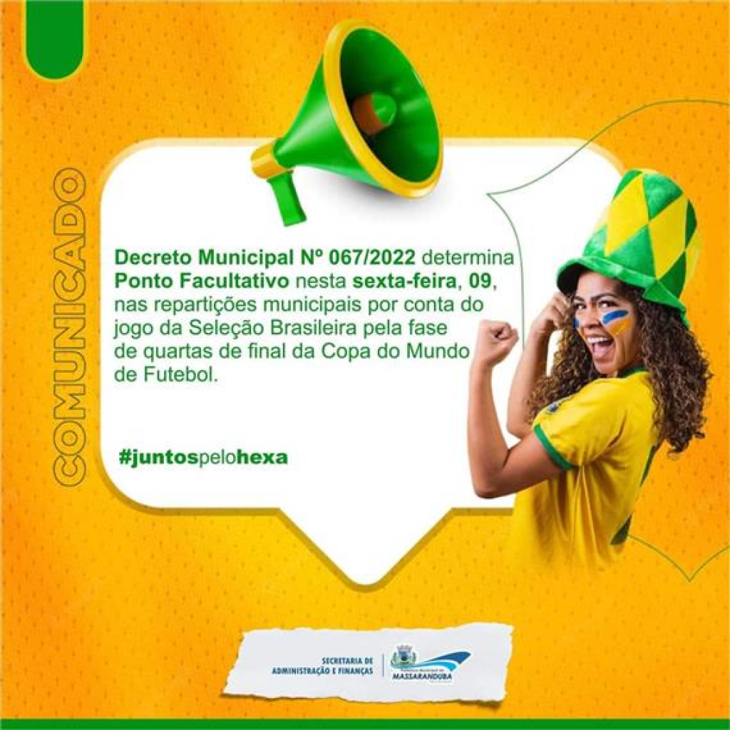 BRASIL EM CAMPO: A Prefeitura de Massaranduba decretou Ponto Facultativo nesta sexta-feira, 09, dia em que o Brasil disputará uma vaga nas semifinais da Copa do Mundo de Futebol, contra a Croácia, às 12h.
