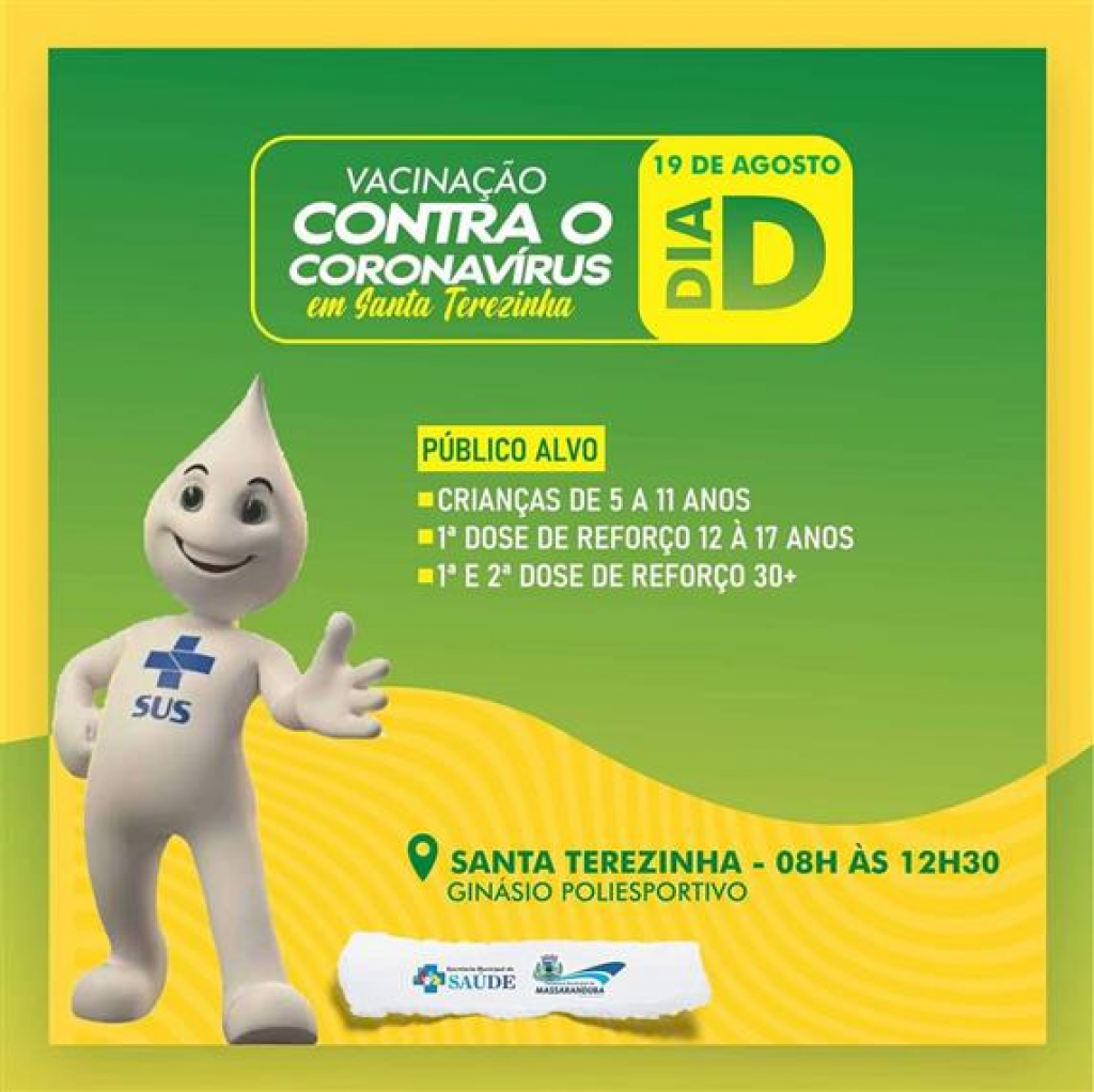 Nesta sexta-feira , 19, acontece o "Dia D" da Campanha de Vacinação Contra o Coronavírus no distrito Santa Terezinha. O atendimento ocorre das 08h às 13h, no Ginásio Poliesportivo.