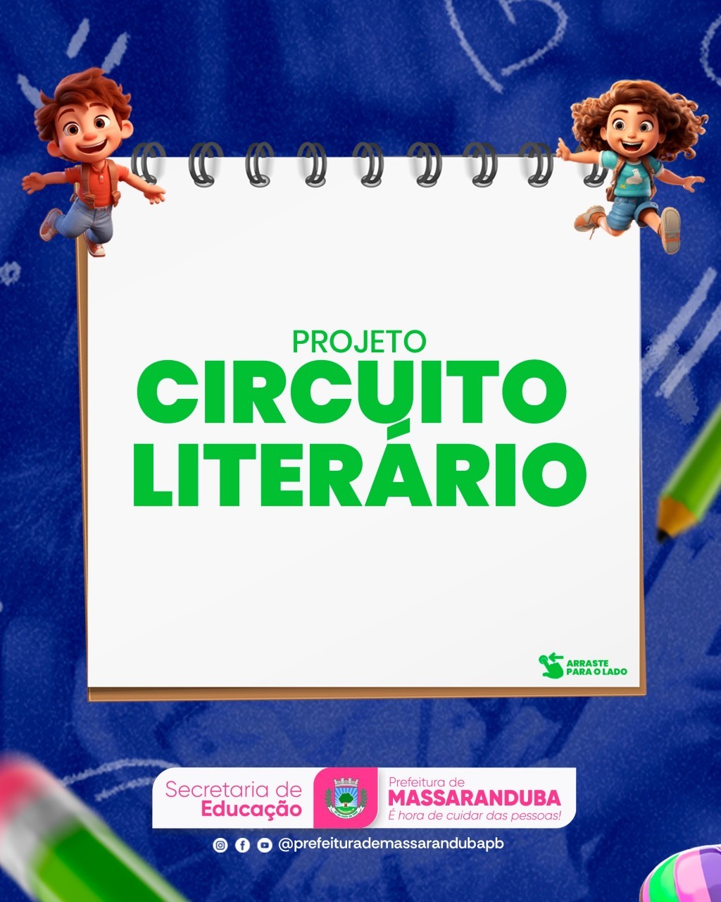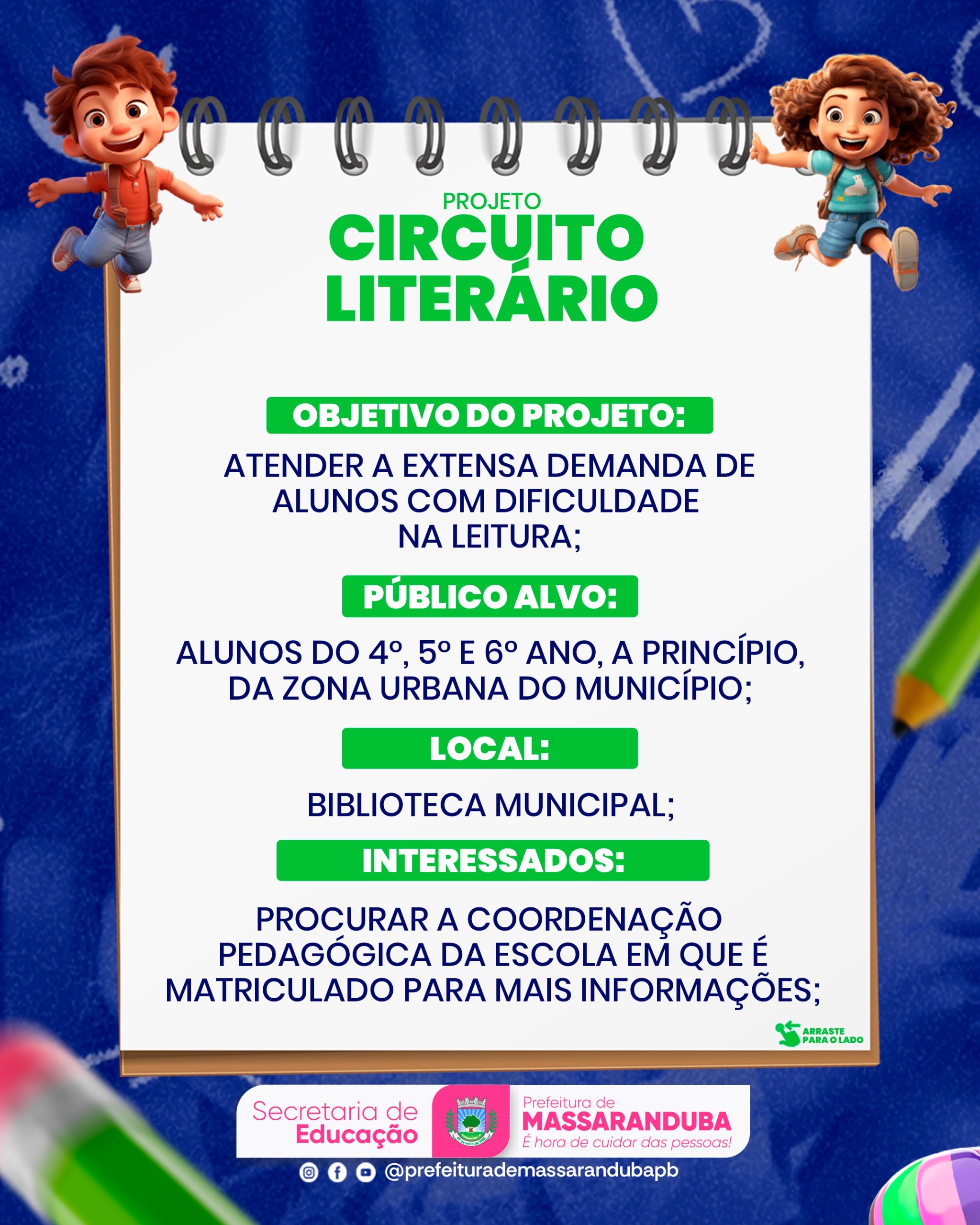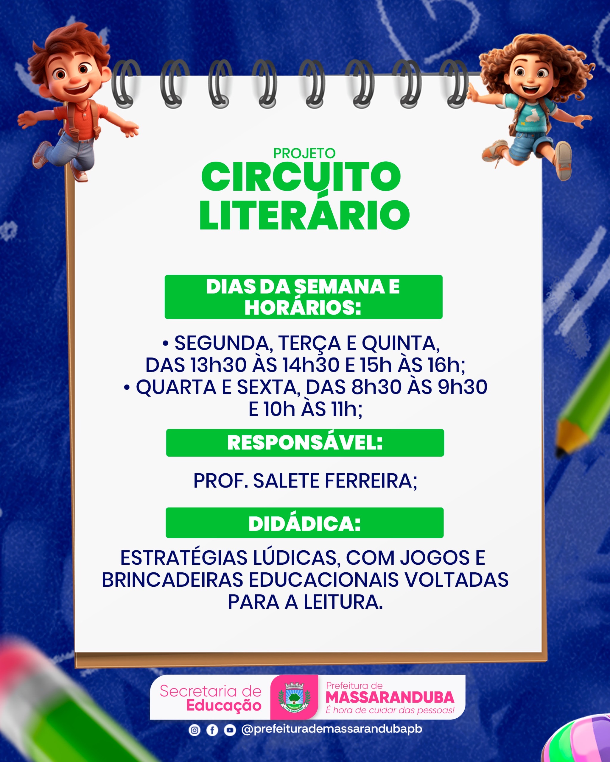 A Secretaria de Educação, sob a coordenação da secretária, Mirtes Almeida e com a responsabilidade da Professora Salete Ferreira, apresenta o projeto Circuito Literário.